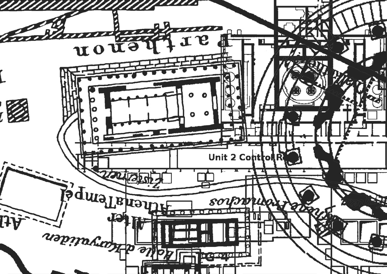 Auf der anderen Seite der Installation ist eine aus der Überlagerung von drei Grundrissen entstandene Grafik zu sehen. Eine Zeichnung, die von nahen beinahe so abstrakt wirkt wie die Malerei. Sie zeigt das, was an diesem Ort, in dieser Parklandschaft abwesend ist und sie dennoch prägt: Es sind Bauten der europäischen Geschichte, die antike Akropolis von Athen, das Tempieto des Renaissance Architekten Bramante und der